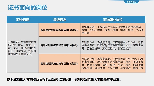 1+X证书分为初、中、高三个级别依次递进,高级别涵盖低级别职业技能要求。主要面向从事智慧物联系统安装、配置、规划、部署、实施、优化升级、管理、维护交付、项目管理等相关工作人员。为高职院校量身打造,bob“1+X·智慧安防系统实施与运维”课程,基于行业实战需求搭建校园与AIoT的桥梁,提升学生职业竞争力。