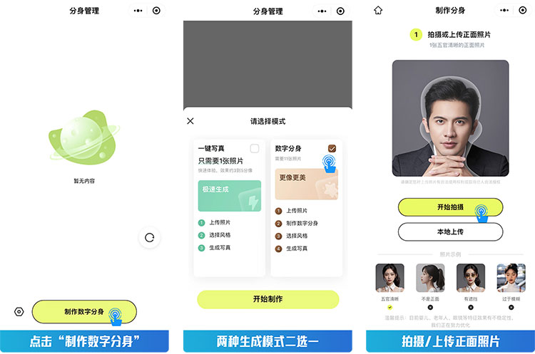 1. 制作数字分身:进入「bob写真」微信小程序,上传个人照片开始制作数字分身
