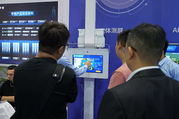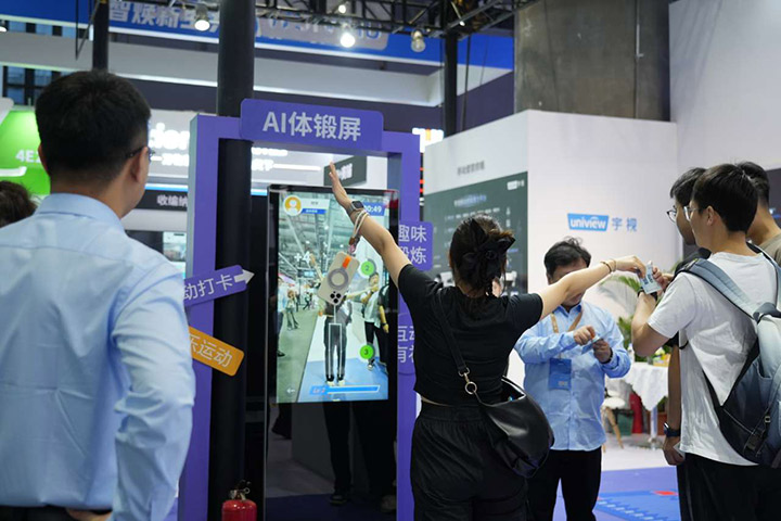 在现场的AI体育沉浸式互动区,大批观众前来围观体验各项趣味运动。AI体锻屏、AI体测屏和体育教学屏,不仅可以帮助校园开展运动、教学,也为社区锻炼等更多场景提供了可能性。