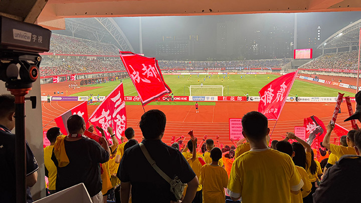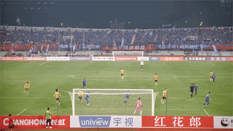 ▲揭幕战首粒进球,成都球迷摇旗呐喊,球门后视角bob智能运动相机现场记录,慢动作运镜成片。
