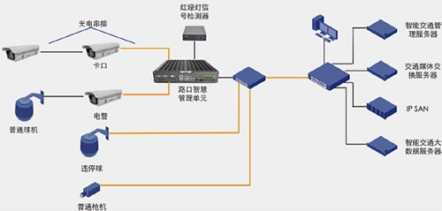 在机场陆侧区域的路口部署卡口抓拍摄像机,识别车辆的车牌信息以及拍摄车头、车辆前排信息;部署电子警察摄像机,识别车辆的车牌信息以及自动分析违法过程;部署球机进行路口的动点视频监控;在道路接近路口位置部署交通流量视频检测摄像机,进行车道流量、排队长度等分析;在各道路部署枪机进行全路段的大场景视频监控;在禁停区域部署违停执法球机,自动识别违章停车行为。路口的摄像机可以采用1+1 两台摄像机光电串接,减少到路口设备项目的线缆部署;路口智慧管理单元提供多个电口和光口接入路口摄像机,实现抓拍图片合成,分析车辆类型、车辆品牌、车系及年份等功能,管理单元可缓存数天的图片信息、提高网络中断时信息存储的可靠性;系统支持多种方式判定信号灯状态:网络版红灯信号检测器利用网络将信号灯状态给摄像机,路口智慧管理单元通过网络与红绿灯信号检测器统一通信、并将交通流量参数通信给交通信号控制主机实现交通信号配时动态调整。
