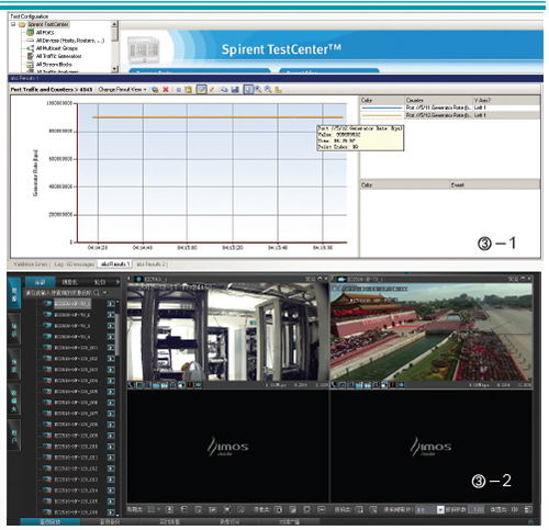 QoS技术:可对网络的流量加以区分,在网络拥塞的情况下,对重要的视频监控数据打上高优先级标记,在交换机中优先被转发,用于获得网络阻塞下重要信息的及时送达、让重要图像先走、抛弃低优先级图像等优化效果。在测试过程中,首先使用思博伦测试仪TestCenter,手动打入大量的垃圾业务制造网络拥塞,点播拥塞网络中的监控实况发现图像卡顿,很不流畅。第二步手工触发高优先级的报警业务,可观察到报警业务联动的实况图像即刻变得流畅清晰,低优先级的实况图像仍旧很卡顿(图3)。
