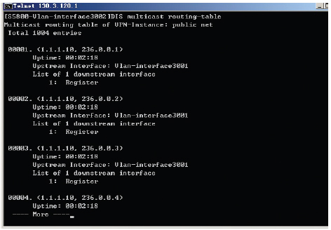 测试环境中有1000路真实的组播视频摄像头,在客户端查看4路真实视频图像,在核心交换机查看组播转发表项;随后利用思博伦测试仪模拟接收1000路真实的视频图像,查看核心交换机中有1004条组播转发表项,说明交换机正对1004条数据流进行组播转发,模拟实际应用中1004条实况媒体流的组播转发;此时查看这4路真实的视频图像,图像清晰流畅,无卡顿现象(图6)。