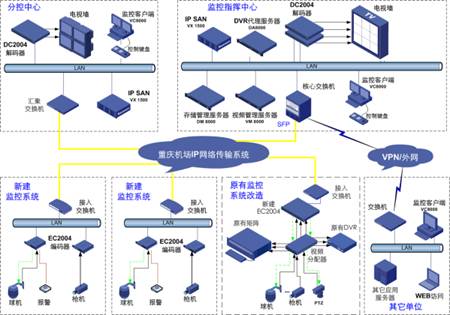 重庆机场T2航站楼视频监控完全采用IP方式承载,在各前端监控点部署视频编码器将监控摄像头的模拟信号转换为IP数字信号,通过IP承载网,将视频图像传送到监控中心进行集中管理;监控中心则通过视频解码器将图像呈现在大屏幕上,同时将图像集中存储。同时,各业务部门也通过弱电专用网络进行视频资源的调用,实现资源的统一管理和灵活扩展。