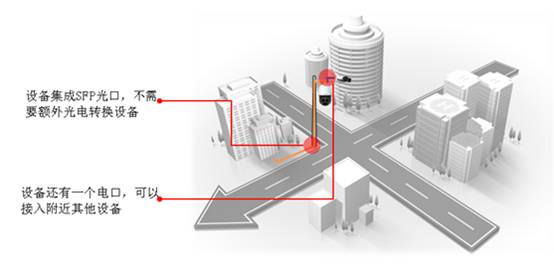 由于普通网线的传输距离限制,网口款的HIC6622X33-IRL适用于短距离监控,一般的园区、学校等中小型监控系统中比较常见。但在平安城市、大型园区等项目中,部分球机与交换机之间的距离太远以至于网线无法进行传输,此时可以采用光纤传输,SFP光口款的HIC6622X33-IRL内置光模块,直接通过光口与交换机连接,相较于传统的外置光电转换器方案,这种设计可靠性更高,施工更加便捷,同时SFP光口款HIC6622X33-IRL也配有一个网口,该网口可以接入就近的其他网络设备如另一个网络摄像机,两者的数据都通过光纤回传到中心,从而大大降低布线成本。