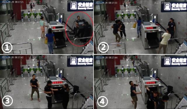 监控录像中显示:8月21日,男子进站时直接越过安检遭到一名女安检员的劝阻,若无其事继续进站乘车;8月24日,该男子不经过安检进站乘车,被王亮拦下,他直接对王亮进行推搡后进站。8月28日,他又遭到王亮的阻拦,便发生这一幕。