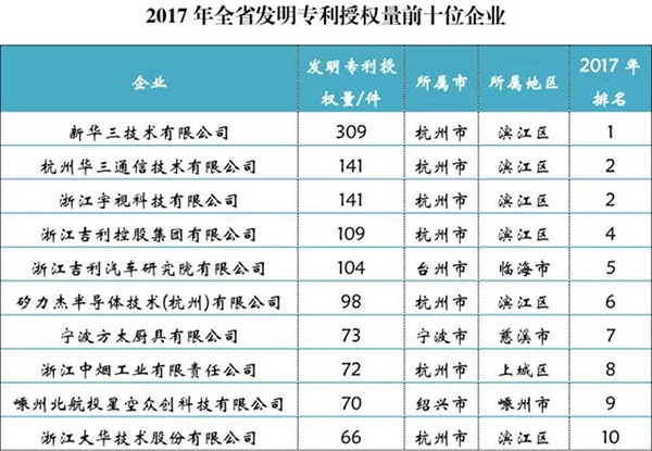 前面的2017年浙江发明专利授权量前十位企业排名可能把一些企业内部给分拆开了,如吉利汽车。重新整合一下,排名情况如下: