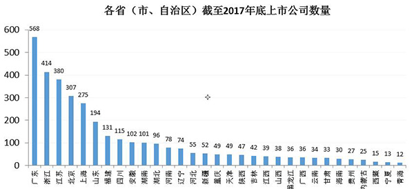 到2018年初,浙江共有沪深两地上市公司415家,总量居第二位。最多的是广东,569家。2017年全年,浙江发行新股的企业就有87家,仅次于广东的98家。以下是截至2017年12月30日统计的内地各省(市、自治区)拥有的上市公司数量。