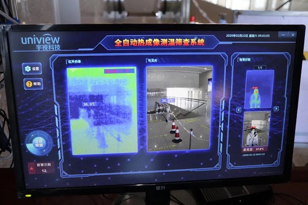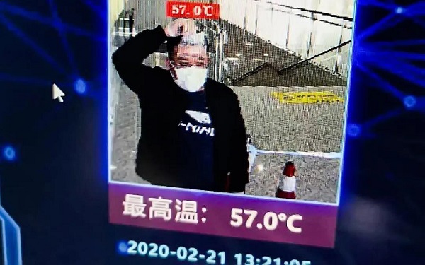 在21日调试过程中,防控队员手持热水杯通过时,仪器立即响起“嘀嘀”报警声,显示体温57℃。负责调试的技术人员说,人走过大约一秒内就可进行实际测量,一旦监测到体温超过设定值就会自动报警并拍照留存,可大面积快速排查人群中的发热人员。