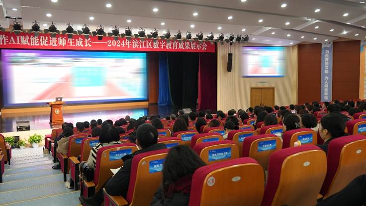 滨江区教育局组织的2024年滨江区数字教育成果展示会以“校企合作AI赋能促进师生成长的滨江实践”为主题,省、市、区教育局领导及相关教研员以及全区各学校(幼儿园)书记、校(园)长、副校长、CIO等近200人齐聚杭州二中白马湖学校,就数字教育品牌建设及校企、校际数字教育合作等内容进行了分享与交流。