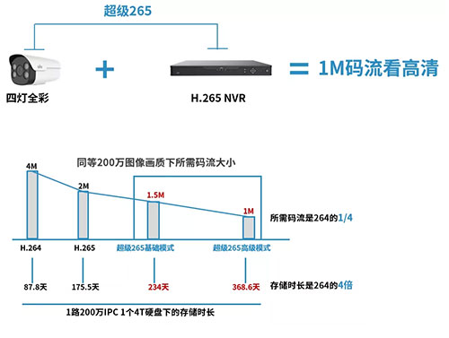 同等200万图像画质下,所需码流大小是H.264的1/4;1路200万IPC在1个4T硬盘下的存储时长是H.264的4倍!
