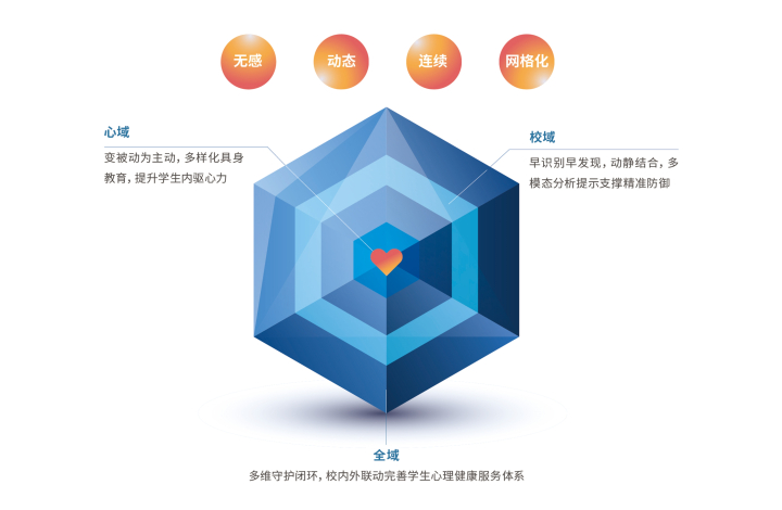 系统以无感、动态、连续、网格化为特色赋能校园身心健康守护,为学校及老师提供了一套全面守护学生身心健康的辅助工具,更早识别需关注“信号”以便给予细致入微的关爱,更及时地关怀需介入事件,更深入地培养提升孩子的心理能量及心理弹性,从而守护青少年更加健康快乐地成长。